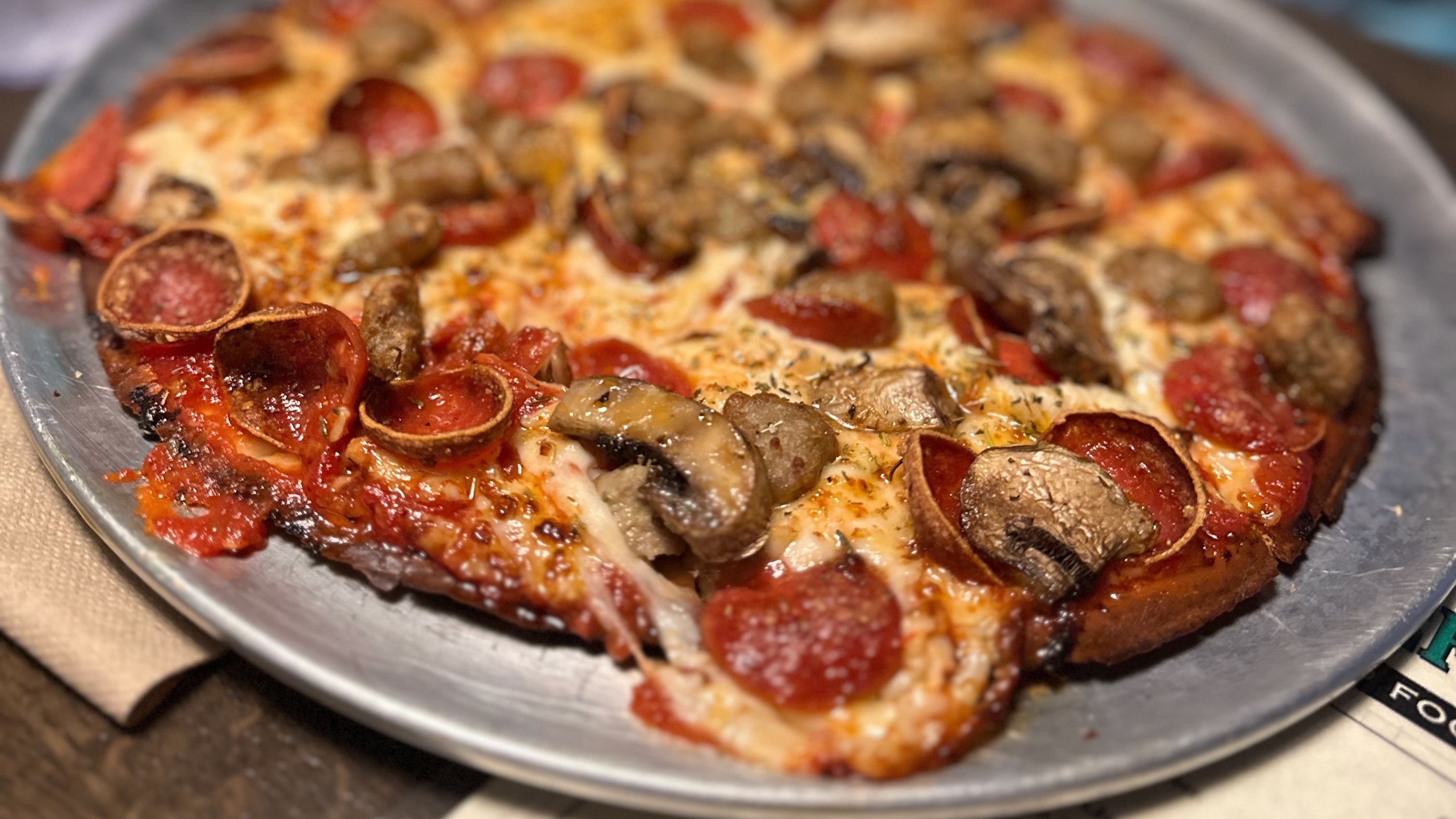 My partner ordered a cauliflower crust pepperoni and mushroom pizza. The flavor of the crust was outstanding with a great, thin-crust-like crisp. The pepperoni was perfectly cupped and the mushrooms rendered down to be juicy and add a great depth of flavor. The sauce is relatively standard red pizza sauce — a nice canvas for well-seasoned cheese topping along with the proteins.